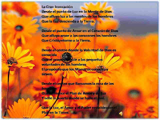 ¿Quiere usted unirse a este trabajo por la paz, la redención y la curación, tanto mental, emocional, como física y espiritual, incluyendo la Gran Invocación en sus pensamientos, oraciones y Meditaciones? La belleza y la fuerza de esta Invocación reside en su sencillez y en que expresa ciertas verdades esenciales que todos los hombres y mujeres aceptan innata y normalmente: la verdad de la existencia de una Inteligencia básica a la que vagamente damos el nombre de Dios; la verdad de que detrás de las apariencias externas de la Vida, el Amor es el poder motivador del Universo; la verdad de que vino a la tierra una gran Individualidad llamada el Cristo por los cristianos, que encarnó ese amor para que pudiéramos comprenderlo; la verdad de que el Amor y la inteligencia son consecuencia de la Voluntad de Dios, y finalmente de que el Plan Divino sólo puede desarrollarse a través de la humanidad misma.